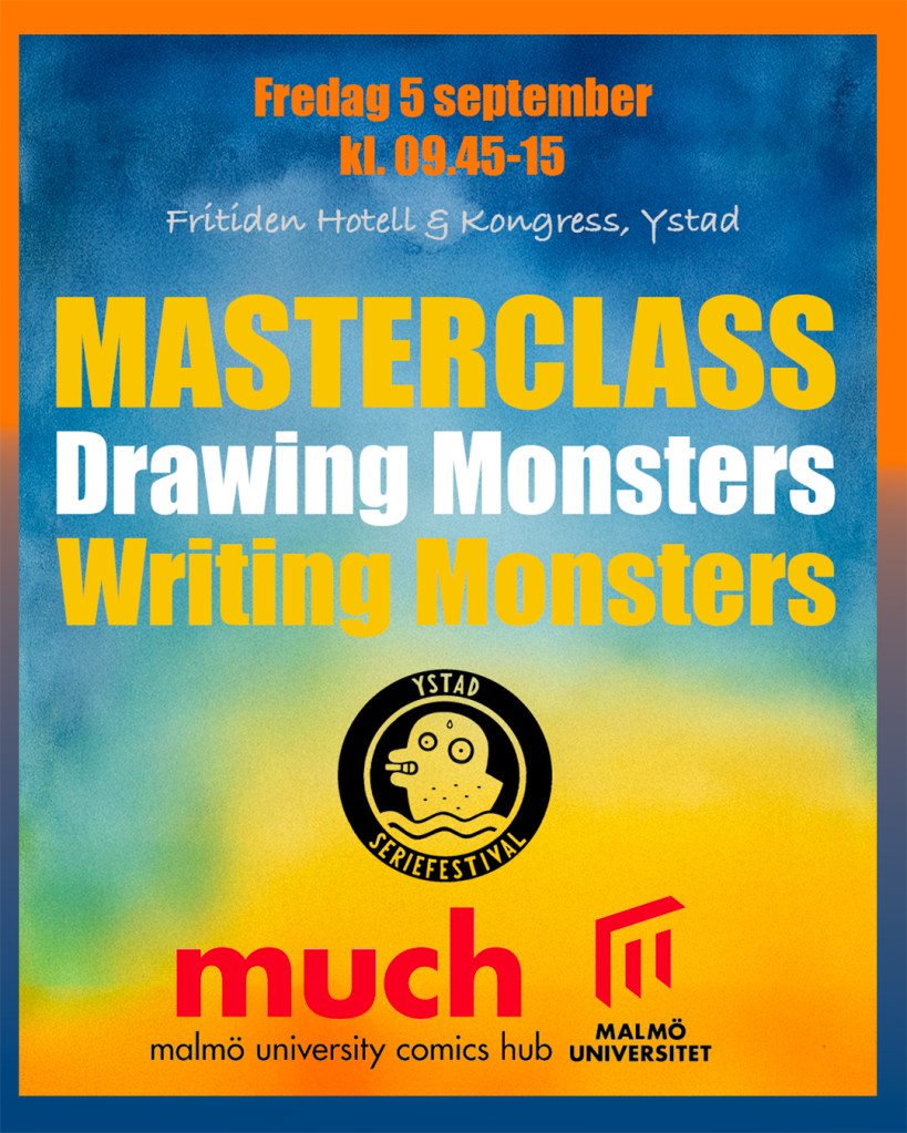 Monster drawing: Denna masterclass leds av Åsa Harvard Maare, utbildad tecknare från Ecole des Beaux-Arts i Paris, och lektor i visuell kommunikation vid Malmö Universitet. Vi kommer att rita monster med utgångspunkt i relationer mellan monstret och något annat. Det kan vara till tecknaren själv, samhället, eller till det ”normala”. Poängen är att utforska hur storlek och position kan bidra till att gestalta monster, och hur monsterteckningar kan bidra till att synliggöra svårfångade tankar och tvivel – och underlätta att dela dem med andra.